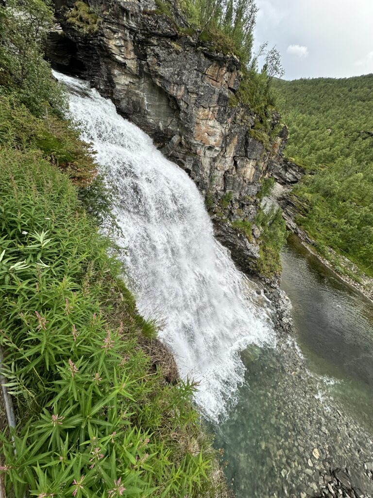 Yykeänperää lähestyttäessä alkoi näkyä lähempää upeita lumihuippuja ja turkoosina hohtavaa jäätikköä, joka oli kuin sininen jättimäinen malja vuorten välissä. Myös vuorten sisään louhittujen tunneleihin sukeltaminen alkoi. E6 tie seuraili Lyngenin vuonoa ja maisemat oli upeat: vuonomaisemaa ja vesiputouksia. Johanna suunnitteli etukäteen vähän Gorsabrun pikku patikointia, mutta se olisi vienyt liikaa aikaa. Poikkesimmekin Birtavarressa etsimään Vuoksajohkan vesiputousta.