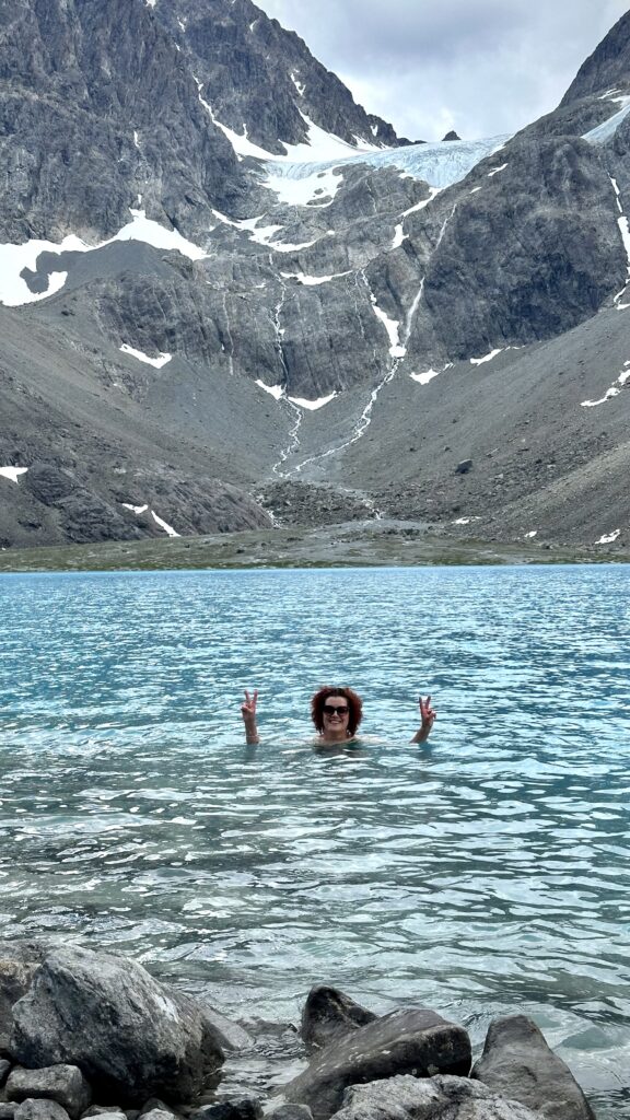 Johannan piti tietysti päästä heti uimaan, sillä tätä oli odotettu hartaasti. Veteen oli hieman hankala liuskekiviltä päästä, mutta ranta syveni onneksi nopeasti. Vesi oli avantokylmää ja varpaita alkoi paleltaa, kun piti kuviakin räpsiä- ja monta. Tomi tyytyi kastamaan varpaat. Kova tuuli alkoi äkisti ja kamat meinasi lennellä. Tomi sai tulet jetboiliin ja syötiin maittavat summit- ateriat. Henkeäsalpaavan upea maisema oli retkeläisillä. Ja vesi- miten se olikaan niin turkoosia, näky oli lähes epätodellinen. Mutta turkoosin väristä oli jäätikkökin, kun tarkemmin katsoi. Sulamisveteen kulkeutuu mineraaleja, jotka värjäävät veden turkoosiksi.