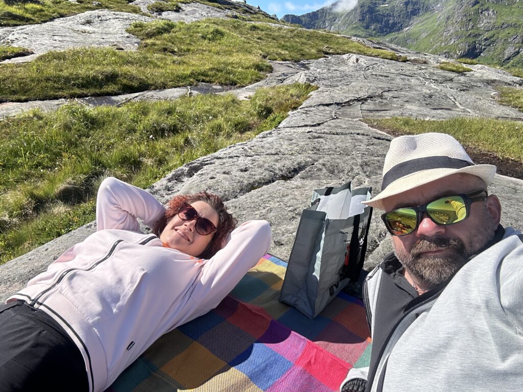 Alkumatka oli helppoa polkua, jota jonkinlainen kuntta reunusti molemmin puolin. Kasvejakin piti matkalla tutkia ja tunnistaa lajeja google lensin avulla. Myöhemmin reitti muuttui kivikkoiseksi ja paikoin oli jyrkkiäkin nousuja. Sauvoista oli kyllä suuri apu ja tuki. Huipulla tuuli melkoisesti ja pudotus oli todella jyrkkä. Panoraamamaisemat olivat huikeat, näkyi vuorijonoja ja Norjanmerta. Löydettiin suojaisampi kohta ”reunalta”, jossa istuskeltiin rennosti pehmeällä mättäällä ja nautittiin eväät. Toki otettiin myös seitsemänsataa selfietä😊