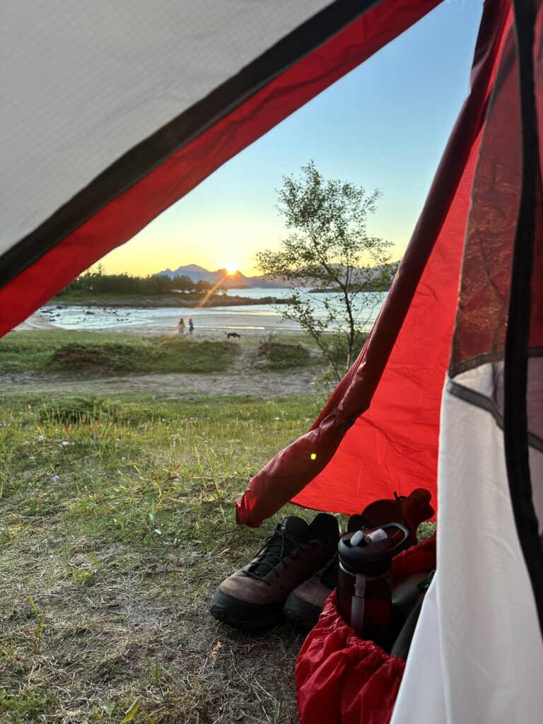 Keskiyön aurinko oli upea ja miten osuikin niin täydellinen sää telttailuyölle. Ihana aaltojen pauhu siivitti molemmat nopeasti uneen. Herättiin monta kertaa, mutta ihme ja kumma Johannakin sai nukuttua. Kuuden jälkeen alkoi kevyesti sadella, mutta se olikin ollut jo etukäteen tiedossa.